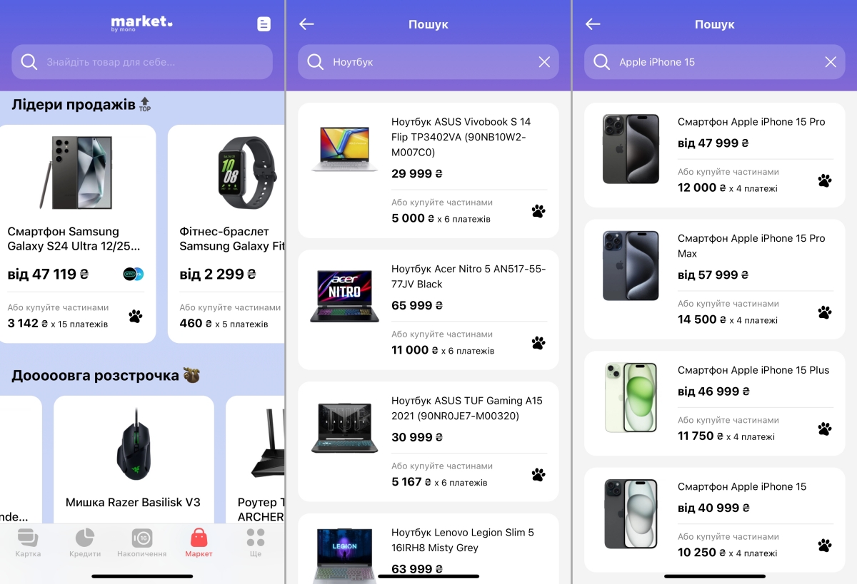 Практичної користі і переваги market by mono поки що не має. Ключове, що замалий вибір товару і недоступні фільтри пошуку. Відтак, покупець однозначно буде шукати товар безпосередньо на сайті тих же таки Moyo, КТС, Click чи на сайтах агрегаторах накшталт Hotline. Відтак, поки є сенс купівлі вже при конкретному запиті, аби швидко і зручно купити товар у розстрочку, яка нативно інтегрована в меню купівлі.