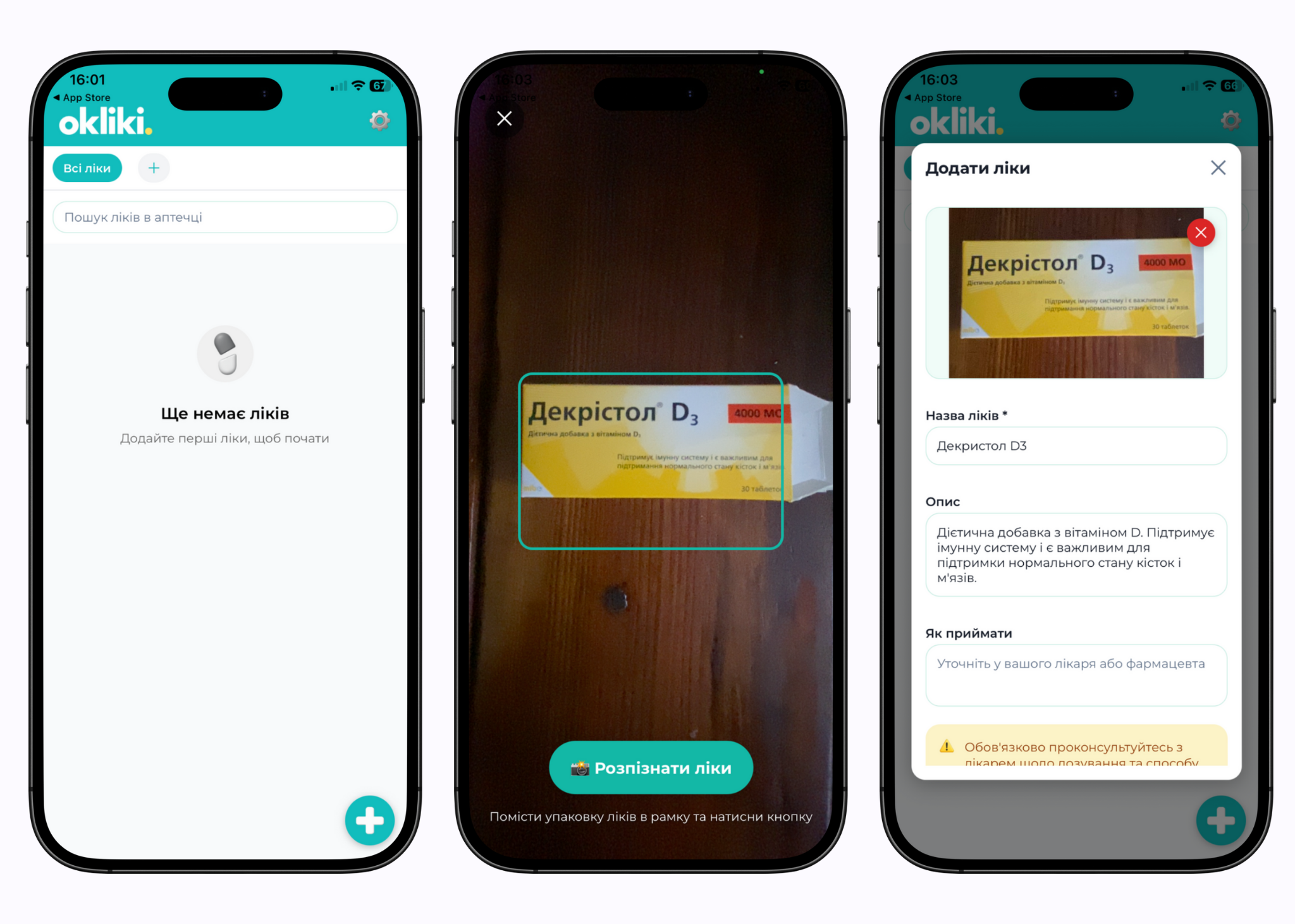 Контролювати наявні вдома ліки можна за допомогою застосунку Okliki. Він допомагає стежити за наявними препаратами, перевіряти терміни придатності та уникати повторних покупок. Створив його українець Ігор Ковалько.