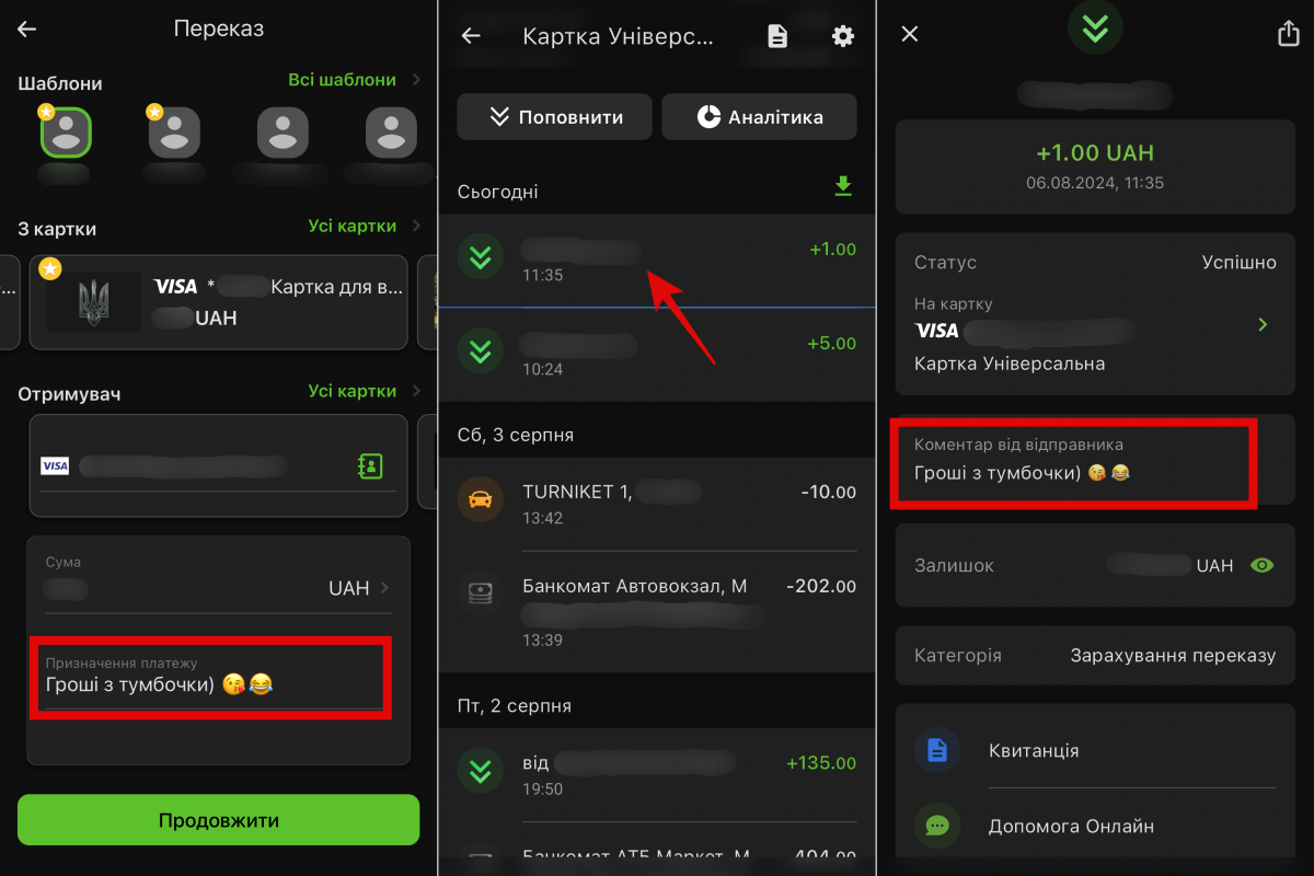 Переглянути залишений коментар отримувач може натиснувши на транзакцію. У деталях переказу буде поле “Коментар від відправника”.