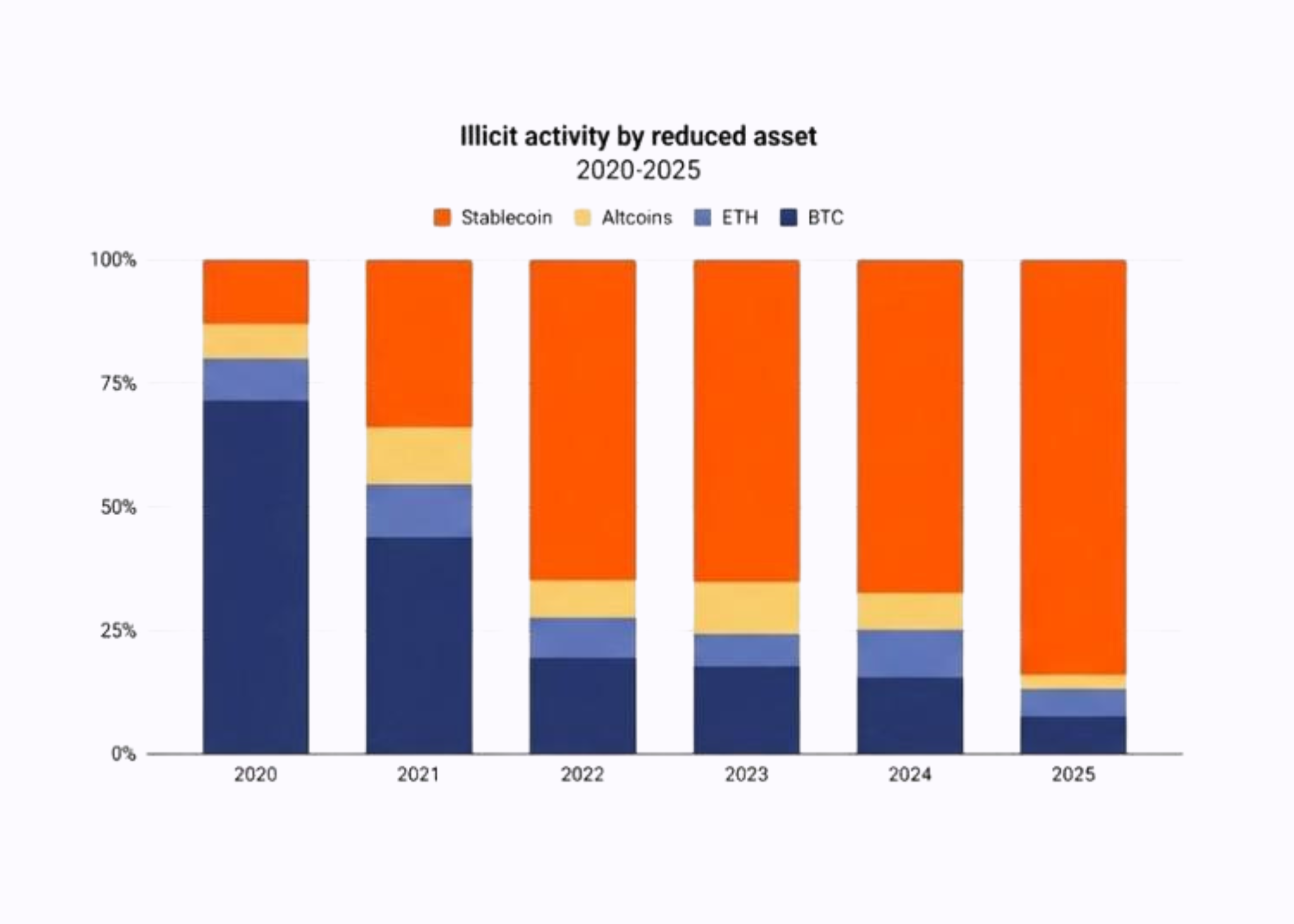 Стейблкоїни стали основним інструментом для незаконних операцій у криптосекторі – у 2025 році на них припало близько 84% усіх незаконних криптотранзакцій. Про це йдеться в аналізі CryptoPotato звіту Chainalysis.