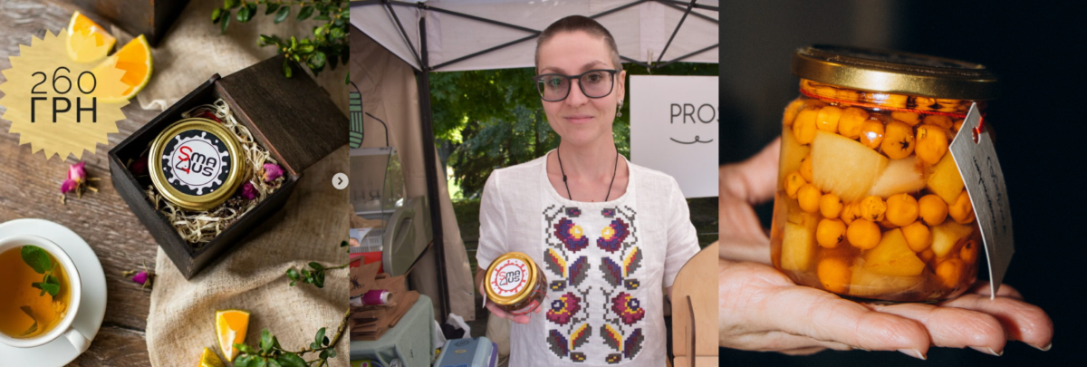 В асортименті залишилися: обліпихове варення, джем “Смородина-апельсин”, варення “Гарбуз-апельсин-лимон” та кабачкова ікра. Обʼєм продукції – 240 г, 350 г та 525 г. В наявності також є травʼяний чай та подарункові набори з 4 банок по 100 г (з випадковими смаками) або 2 банок по 350 г (смаки можна обрати).