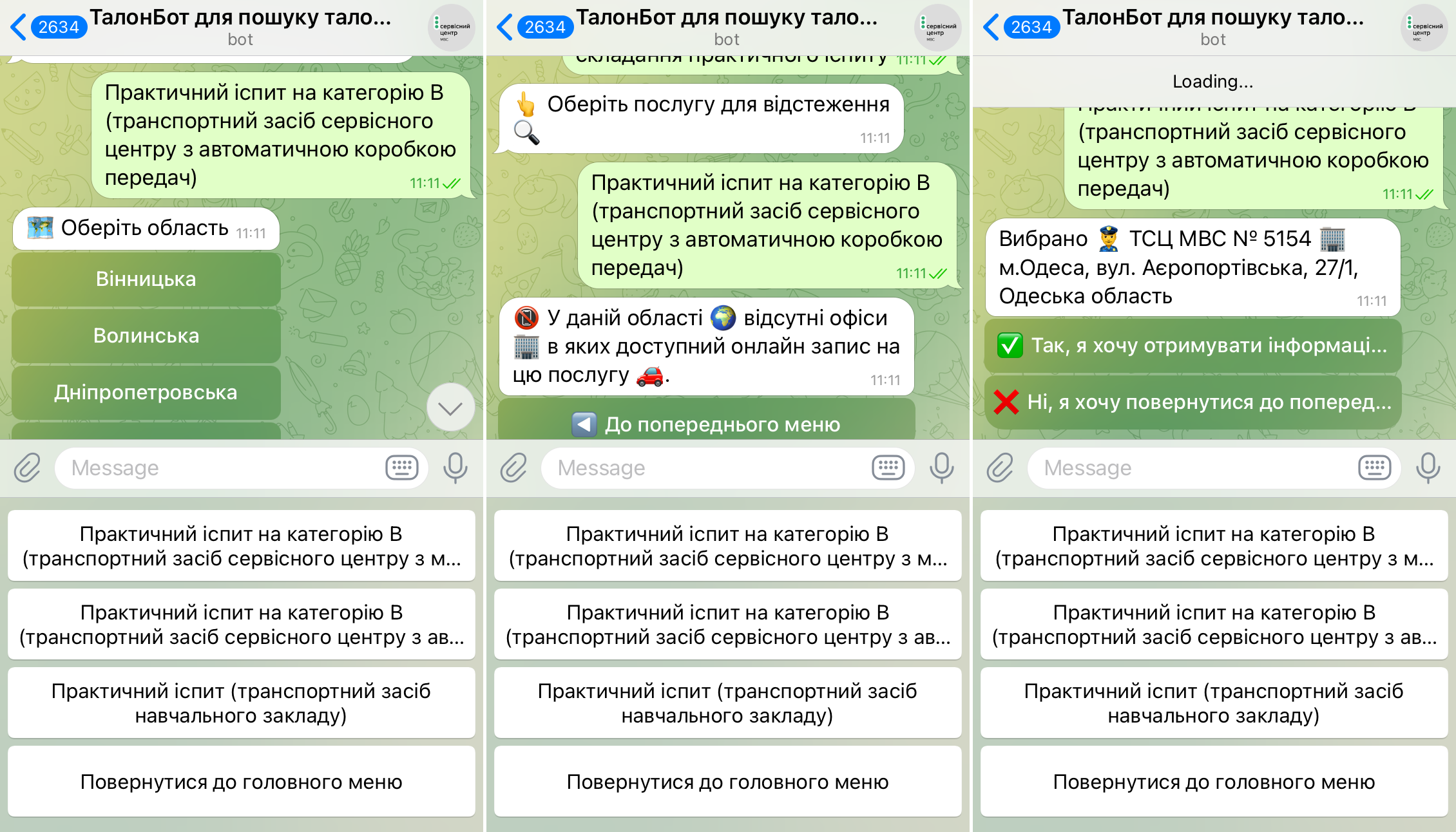 Відтепер записатися на практичний іспит з водіння на категорію В можна онлайн через чат-бот в Telegram. Він надасть інформацію про актуальні вільні талони в сервісних центрах за трьома варіантами: іспит на транспортному засобі автошколи, іспит на автівці сервісного центру (механічна чи автоматична коробка передач). Наявність послуг залежить від можливостей конкретного сервісного центру.