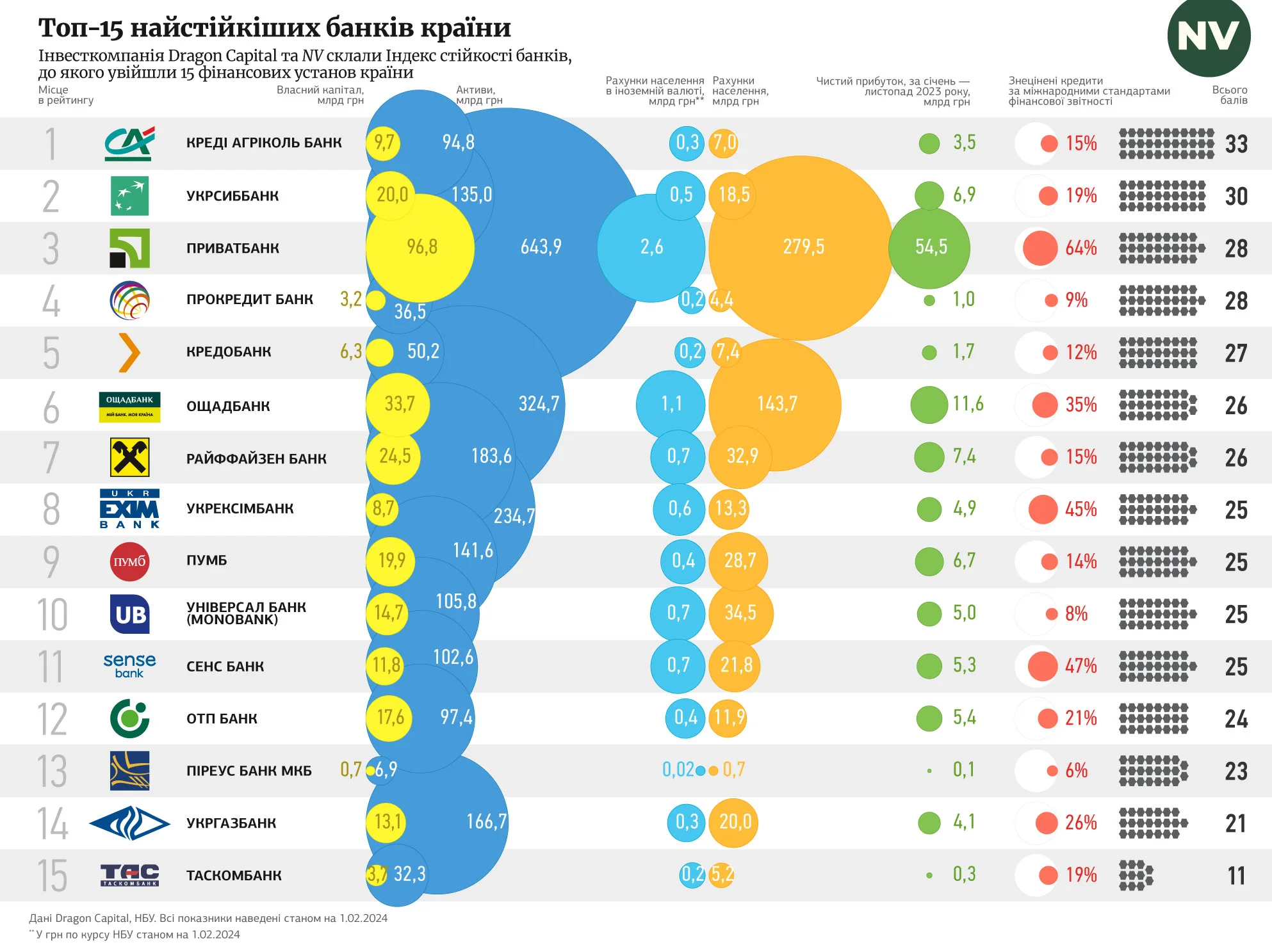 Нині в Україні працює 63 банки. Інвестиційна компанія Dragon Capital проаналізували фінансову звітність банків за 2023 рік і визначила найбільш фінансово стабільні банки.