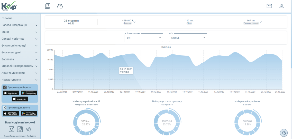 - Вбудовані звіти, аналіз фінансової інформації та популярності страв.