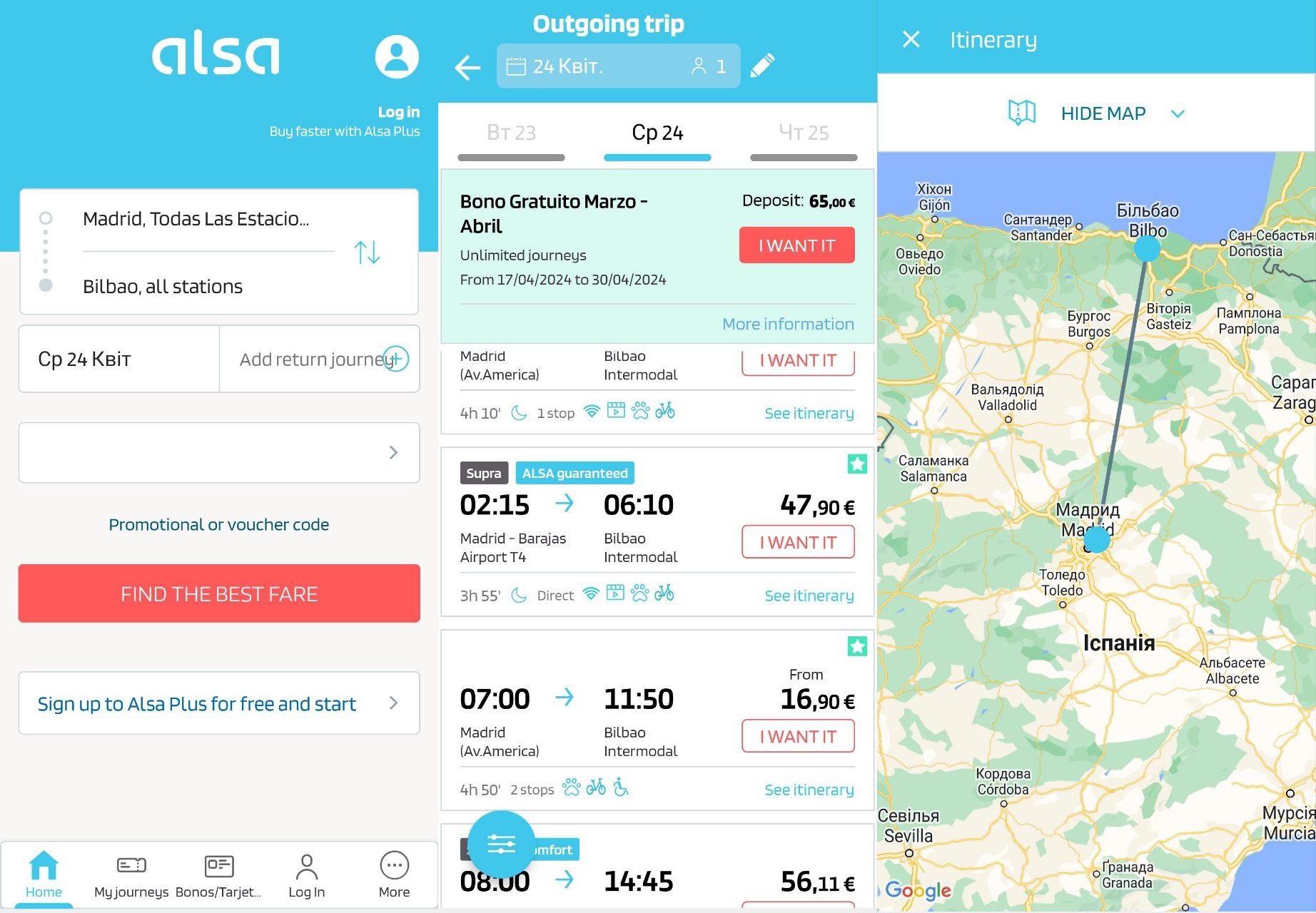 Alsa (Android, iOS) – застосунок найбільшої автобусної компанії в Іспанії. Тут можна знайти автобусні квитки на внутрішні та міжнародні рейси. Також авторизовані користувачі можуть оформити абонемент від 3 до 10 поїздок зі знижкою 50%