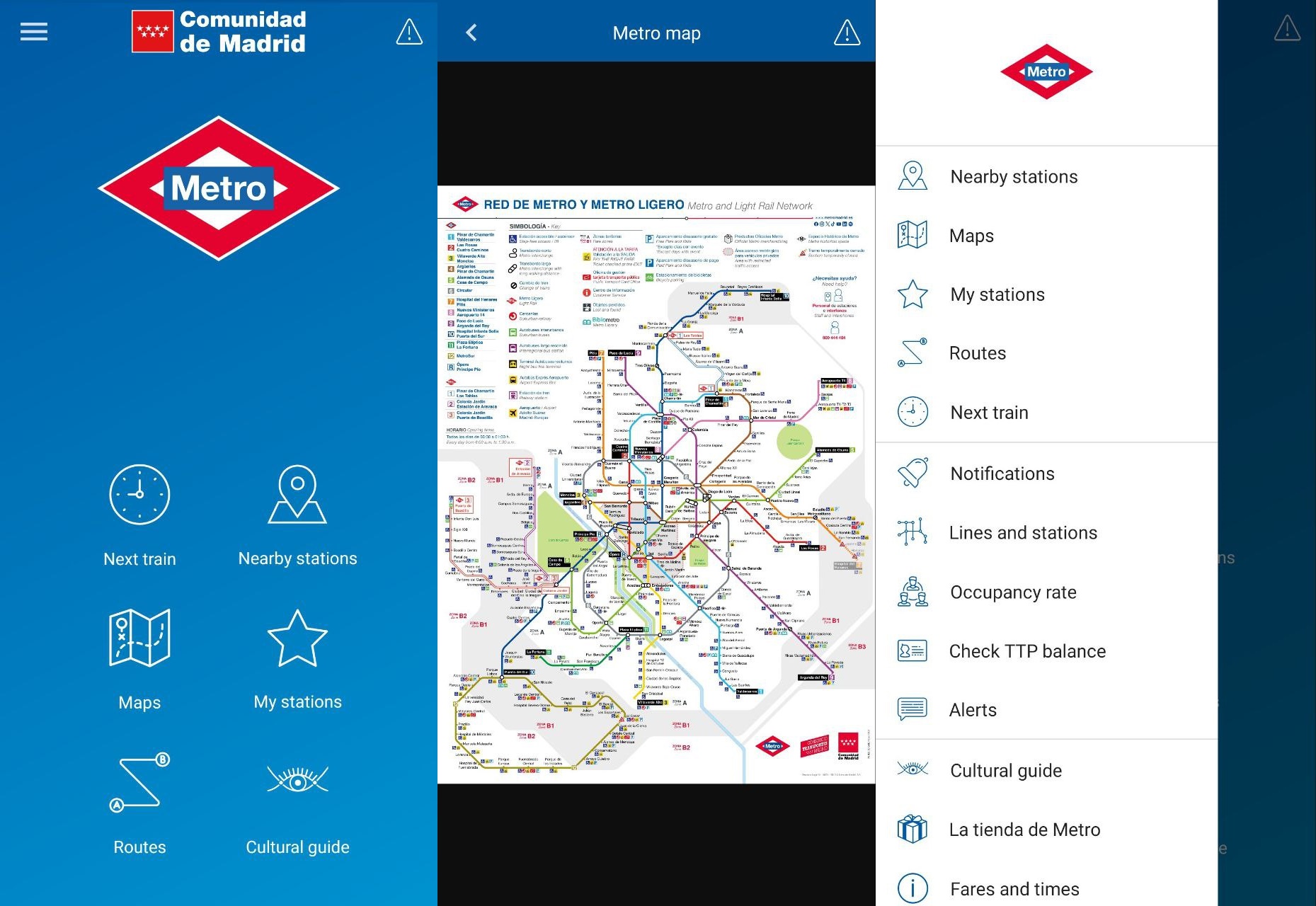 Metro de Madrid (Android, iOS) – офіційний застосунок мадридського метро, доступний кількома мовами (в тому числі англійською). Тут можна знайти розклад потягів метро, перевірити час очікування та переглянути карту мережі.