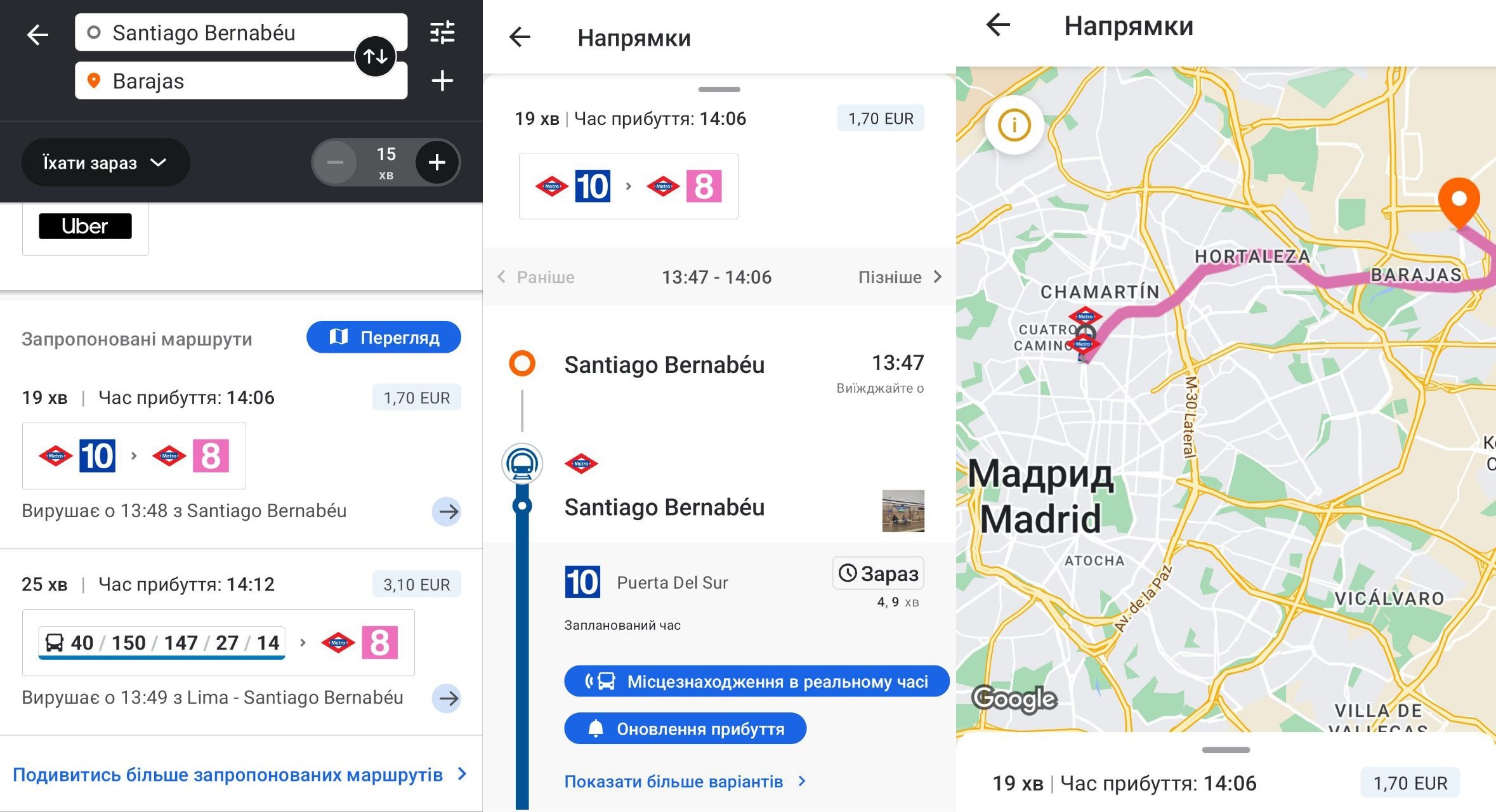 Зверніть увагу, що нараз не можна придбати квитки на міський транспорт Мадрида безпосередньо у застосунку. Для цього потрібно купувати транспорту карту та поповнювати її поїздками. Де і як це зробити – читайте у матеріалі про громадський транспорт Мадрида.