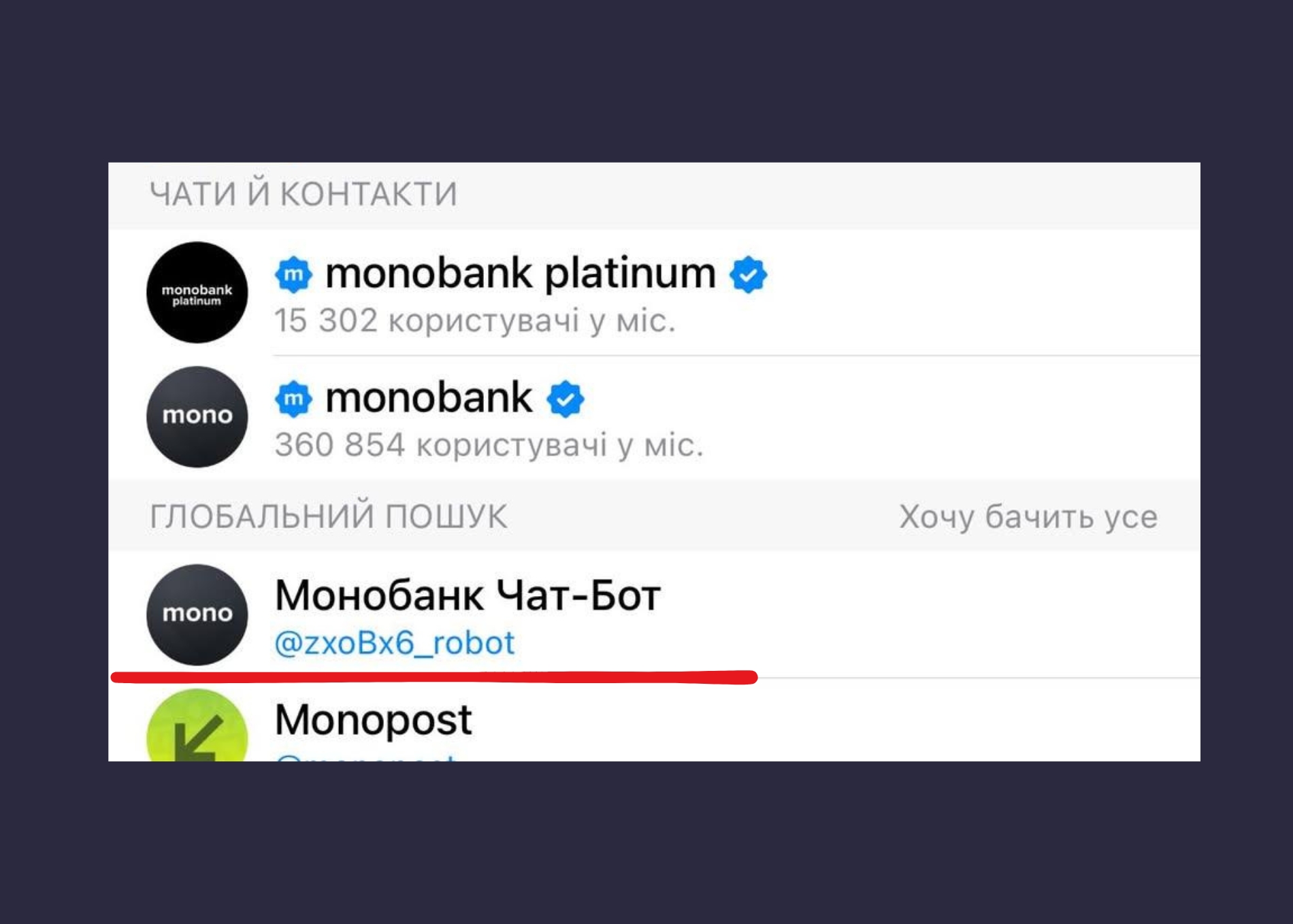 “Вчора я вирішила вивести якусь частину грошей. Monobank переписується зі всіма в Telegram, і зі мною переписувались також. Я намагалась знайти цей чат, ввела у пошуку і мене вибило на чат-бот, як ви вже розумієте, підставний”, – пояснила блогерка у своєму Instagram.