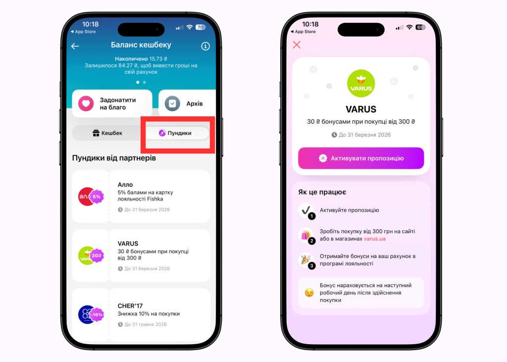 Новий функціонал доступний у меню кешбеку. Там можна обирати різні партнерські пропозиції — всі пропозиції формуються індивідуально для користувачів і оновлюються щотижня. Активувати можна одразу кілька доступних пропозицій.