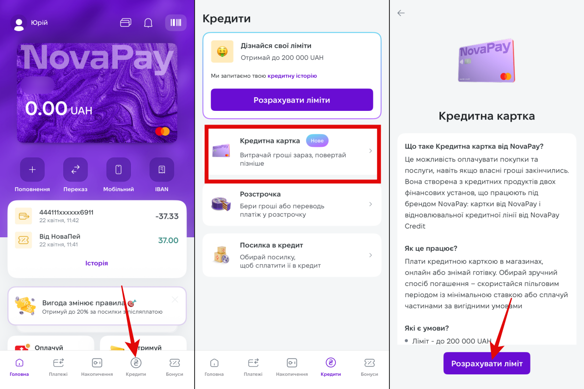 Для оформлення кредитної картки в застосунку NovaPay необхідно на головному екрані обрати розділ “Кредити” – “Оформити кредитну картку”.