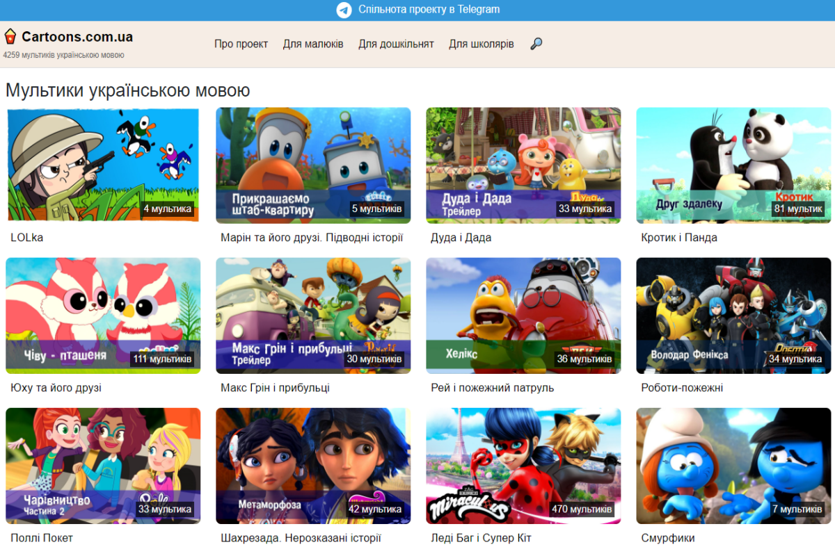 Загалом cartoons.com.ua містить 4217 мультфільми українською мовою. Усі вони розділені на 3 категорії: для малюків, для дошкільнят та для школярів.