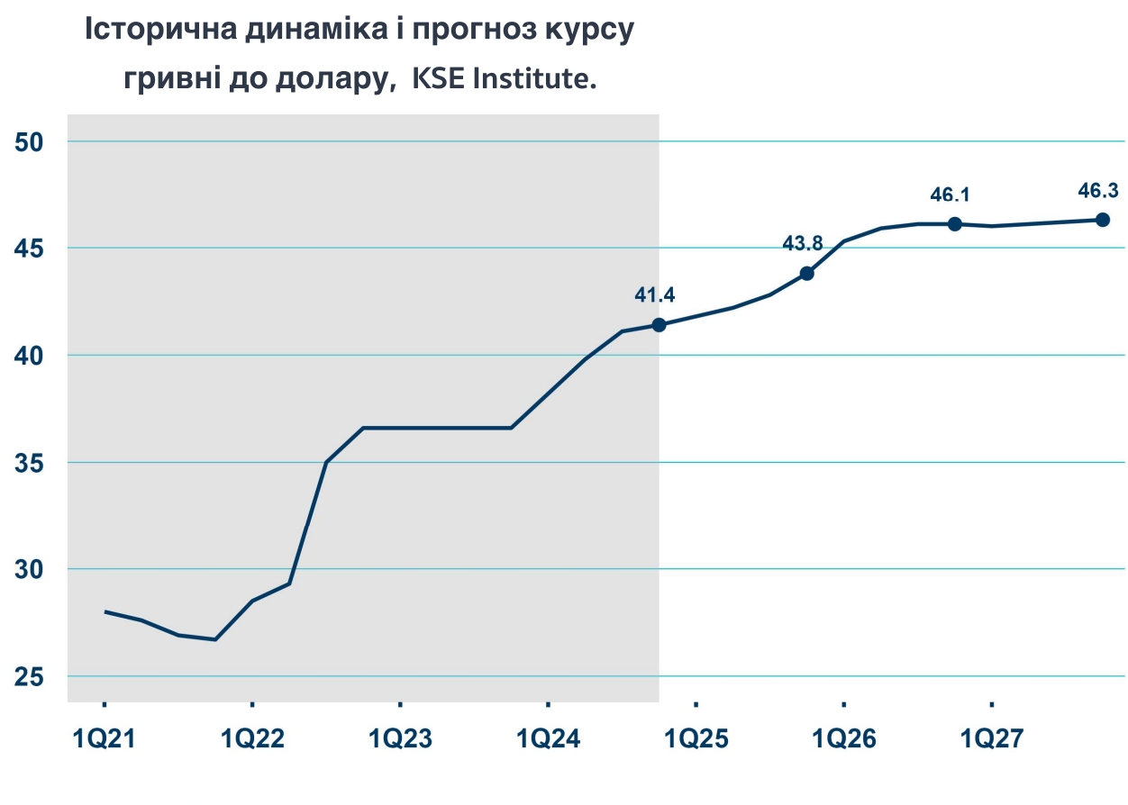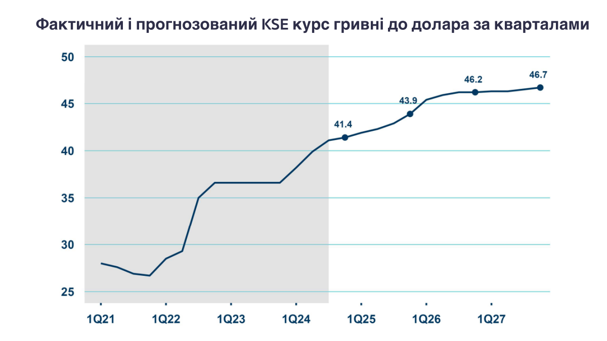 Нагадаємо, наприкінці 2024 року в KSE прогнозували курс на кінець 2025 року на рівні 46,50 грн/$. Втім, в прогнозі від січня покращили свої курсові очікування на кінець 2025 року до “трохи вище 43 грн/$”.
