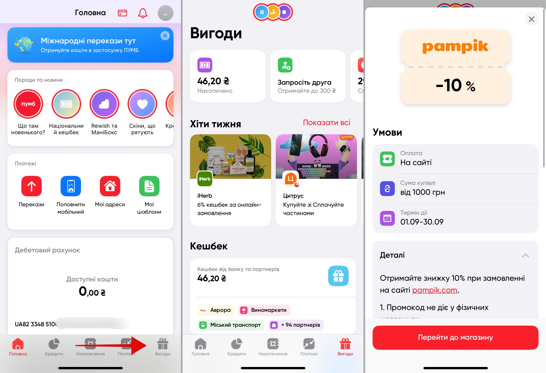 В застосунку ПУМБ відтепер можна отримати разовий промокод на знижку від різних партнерських магазинів і сервісів. Це вже четвертий блок вигод після стандартного банківського кешбеку, кешбеку за реферальною системою і партнерського кешбеку від магазинів.