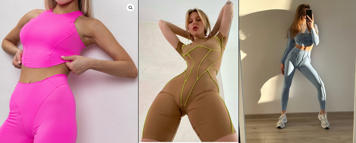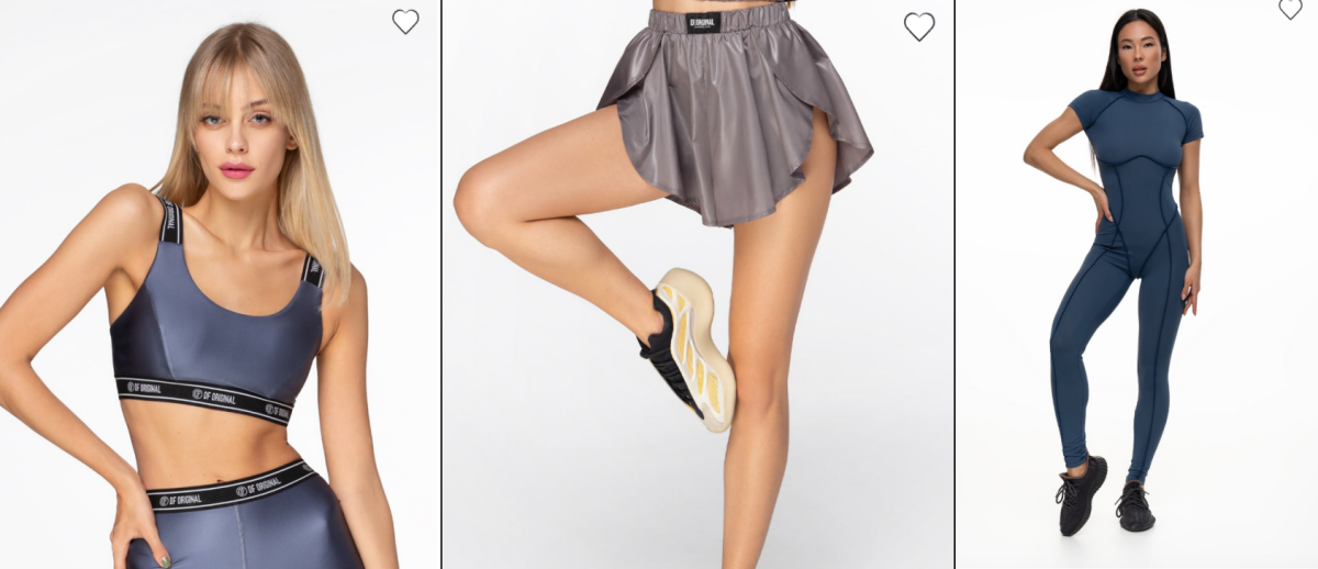 В асортименті є комбінезони, рашгарди, топи, лосини, велосипедки та штани.