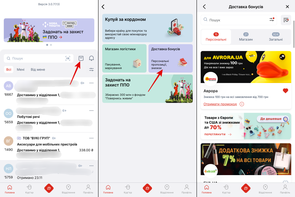 Знайти програму лояльності можна в розділі шопінгу на головні вкладці: знак сумки – “Доставка бонусів” Після натискання на бажану пропозицію необхідно натиснути “Списати” і з’явиться промокод.
