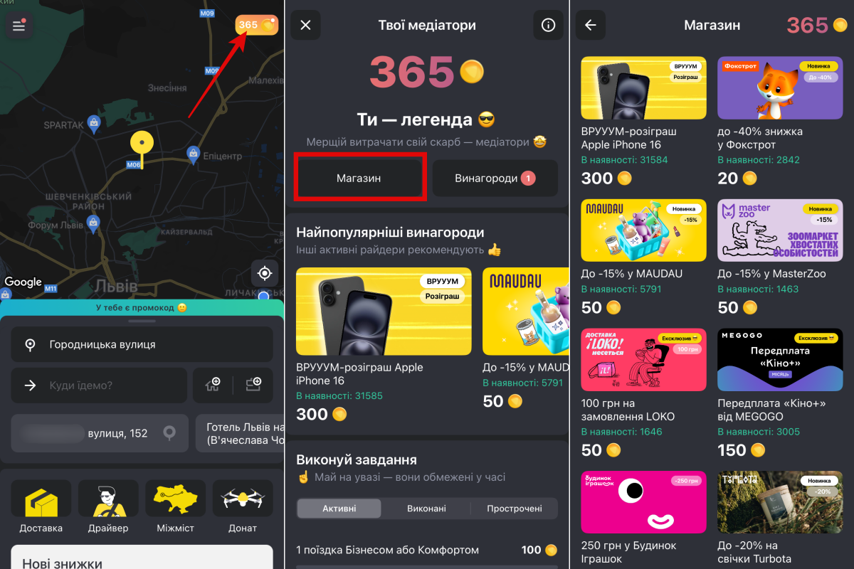 За виконання завдань (наприклад, 3 поїздки бізнес-класом протягом тижня) нараховуються додаткові “медіатори”. Більша кількість балів = більша кількість магазинів та промокодів.