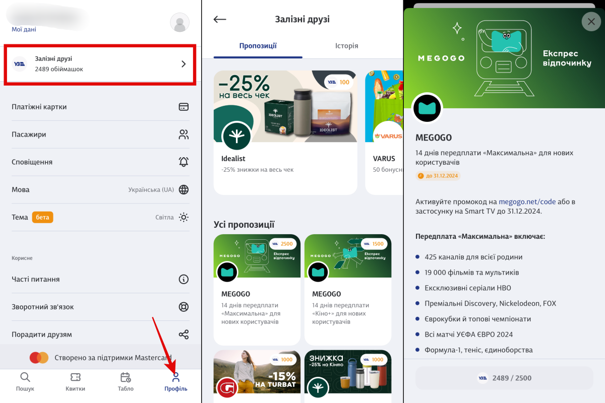 Знайти програму лояльності можна в “Профіль” – “Залізні друзі”. Після натискання на бажану зароблені бали можна списати та отримати промокод.