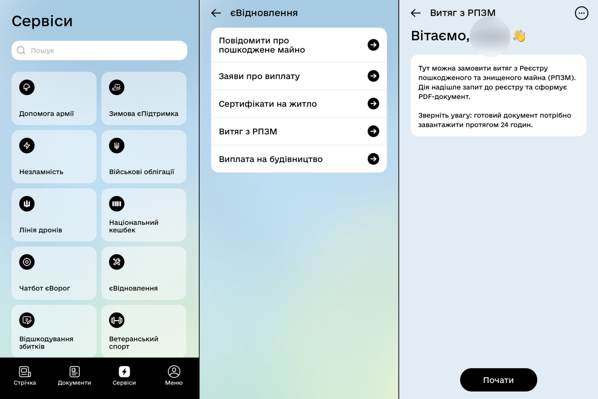 Для отримання витягу у застосунку “Дія” необхідно перейти до розділу “єВідновлення” та вибрати послугу “Витяг з РПЗМ”.