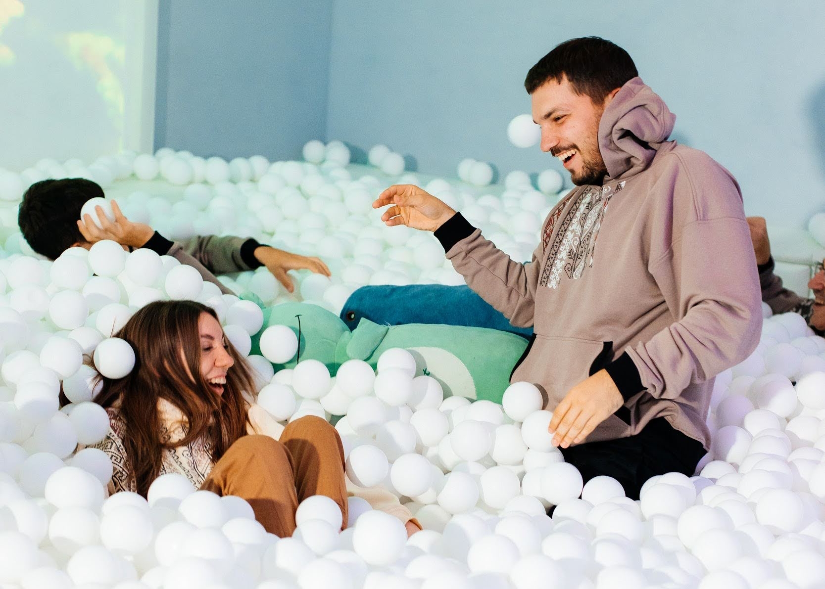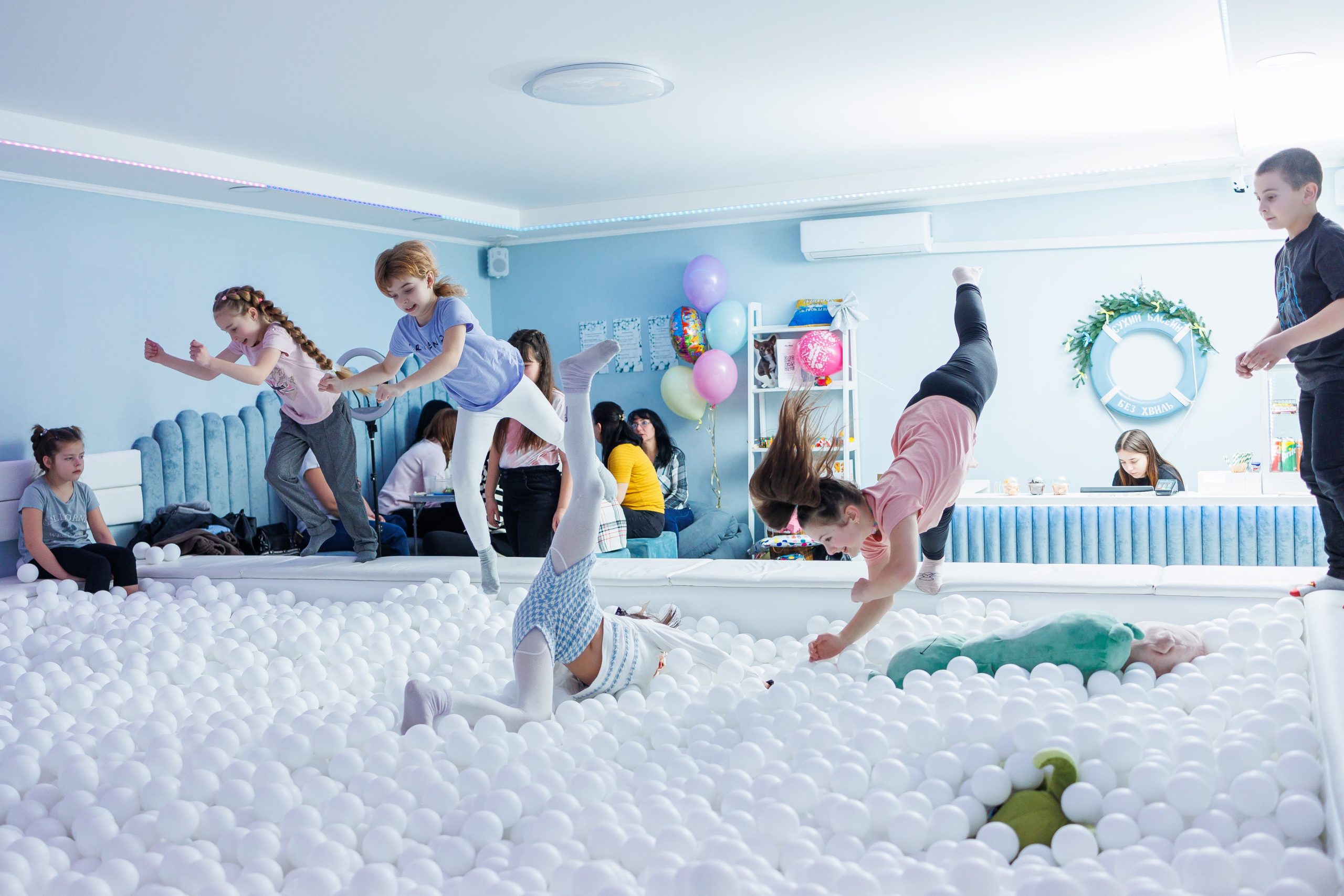 “Без хвиль” — це сухі басейни з десятками тисяч білих кульок у підвальних приміщеннях. Концепція “релаксосховища” з’явилася під час повномасштабної війни: безпечний простір для дітей і дорослих, де можна святкувати день народження чи просто відпочити. “Без повітряних і психологічних тривог”, як каже засновниця.