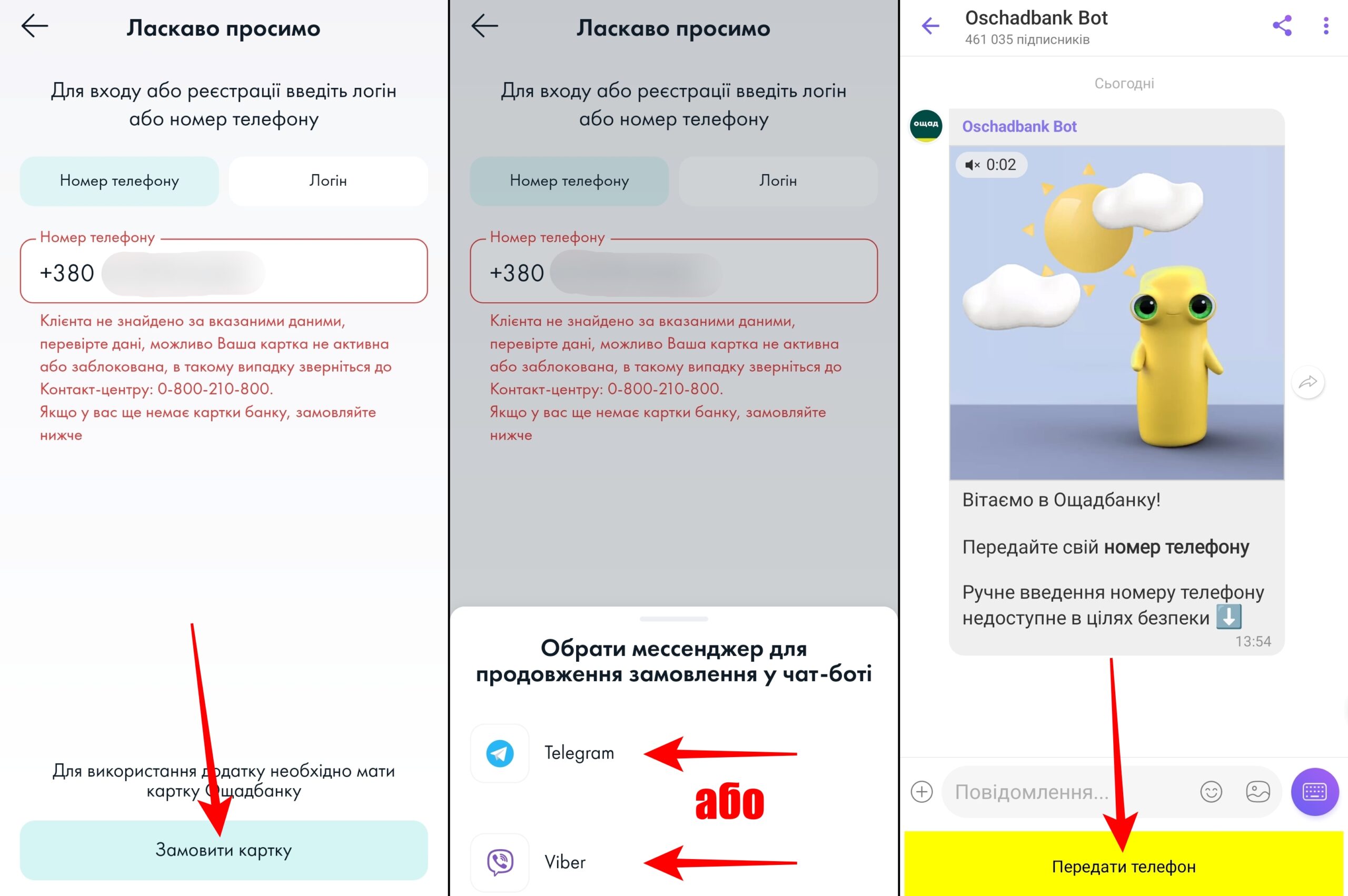 Важливо: номер телефону месенджера та реєстрації в банку мають збігатися, оскільки для завершення реєстрації потрібно надати прив’язаний до Viber або Telegram номер.