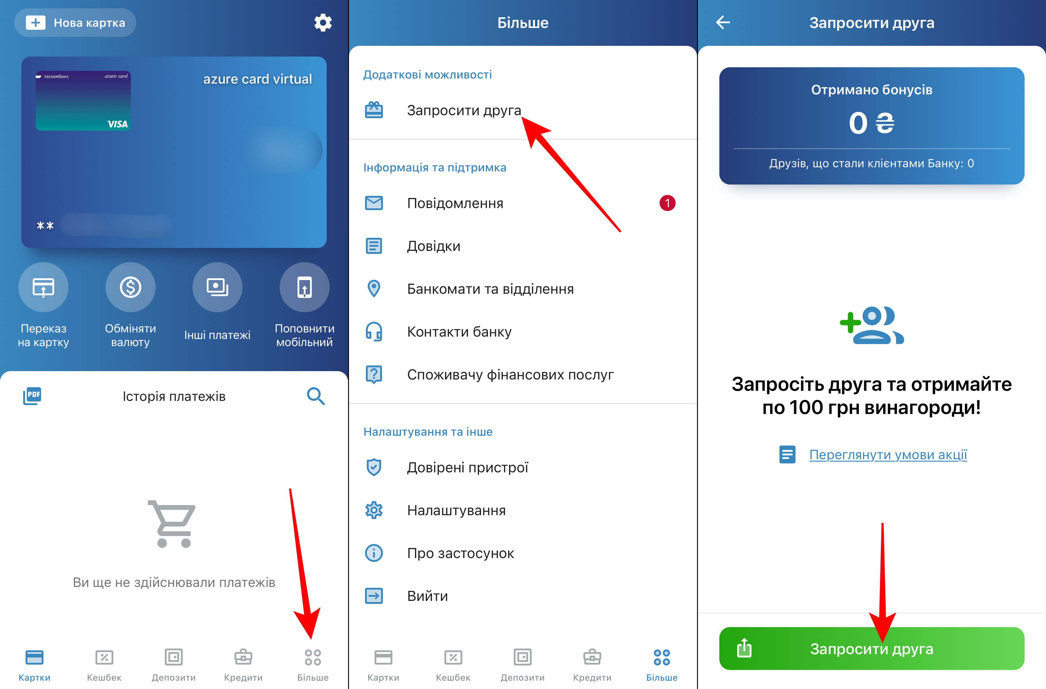 Другу необхідно перейти за посиланням та відкрити картку. Поклик дійсний протягом 30 днів. Після активації картки кожен отримає по 100 грн.