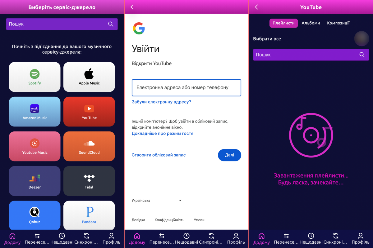 TuneMyMusic доступний лише як вебверсія. Для перенесення потрібно обрати стару платформу, авторизуватися в акаунті, обрати бажані плейлисти та новий сервіс.