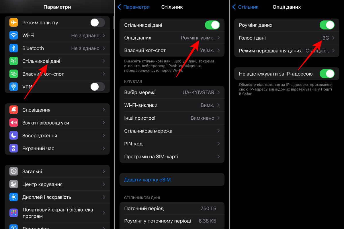 Для iOS: відкрити Налаштування — Стільниковий зв’язок — активувати пункт “Стільникові дані” – перейти в розділ “Голос та дані” – вибрати 2G або 3G.