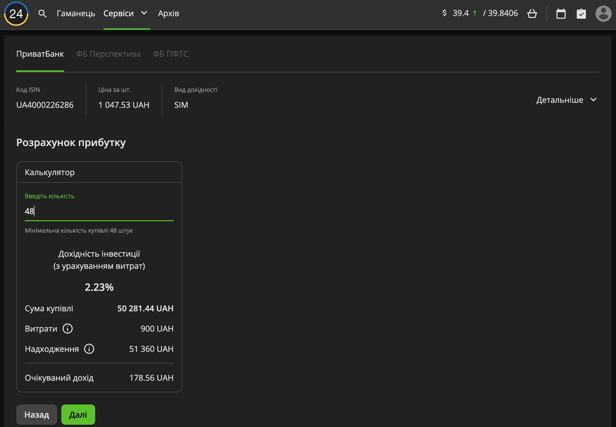 Проглянути доступні для купівлі ОВДП і їх дохідність можна на сайті Приватбанку без авторизації. Водночас в “Приват24” користувачам доступний калькулятор, який надає інформацію про відсоткову ставку, очікуваний дохід та комісії.