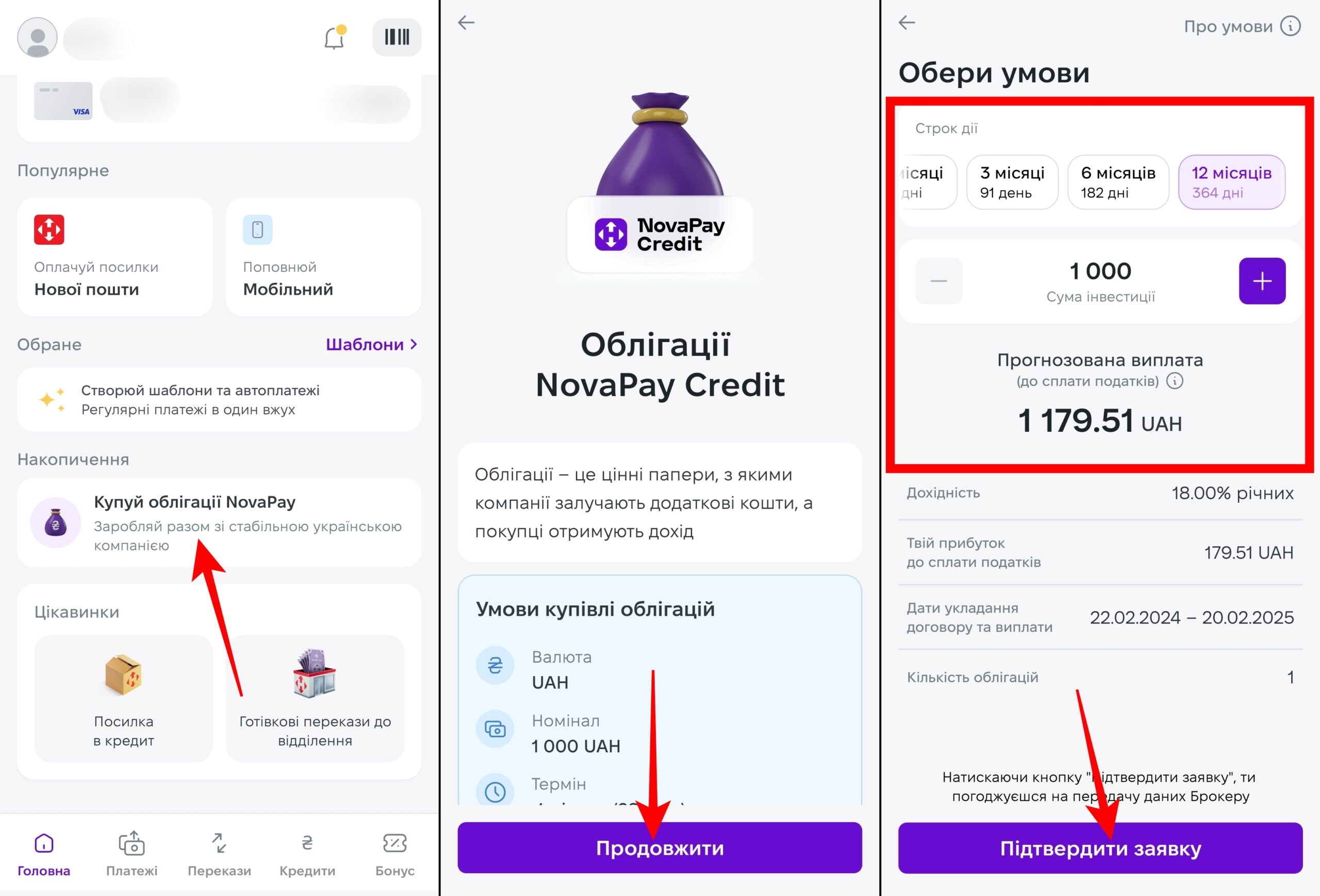 Облігації можна придбати строком від 1 до 12 місяців. Мінімальна сума інвестиції — 1000 грн. Дохід залежатиме від терміну придбання: за 3 місяці надається 16% річних, 6 місяців — 17%, 12 місяців — 18%.