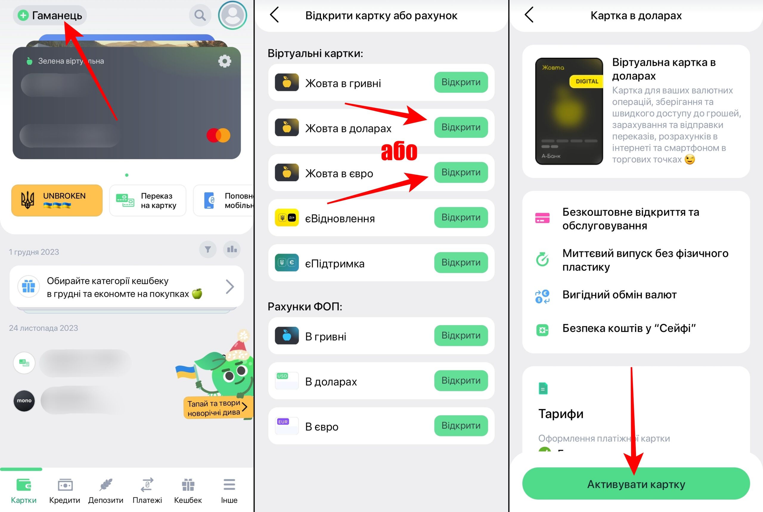 - Обрати картку в необхідній валюті, натиснути “Відкрити” й “Активувати картку” та придумати PIN-код до неї;