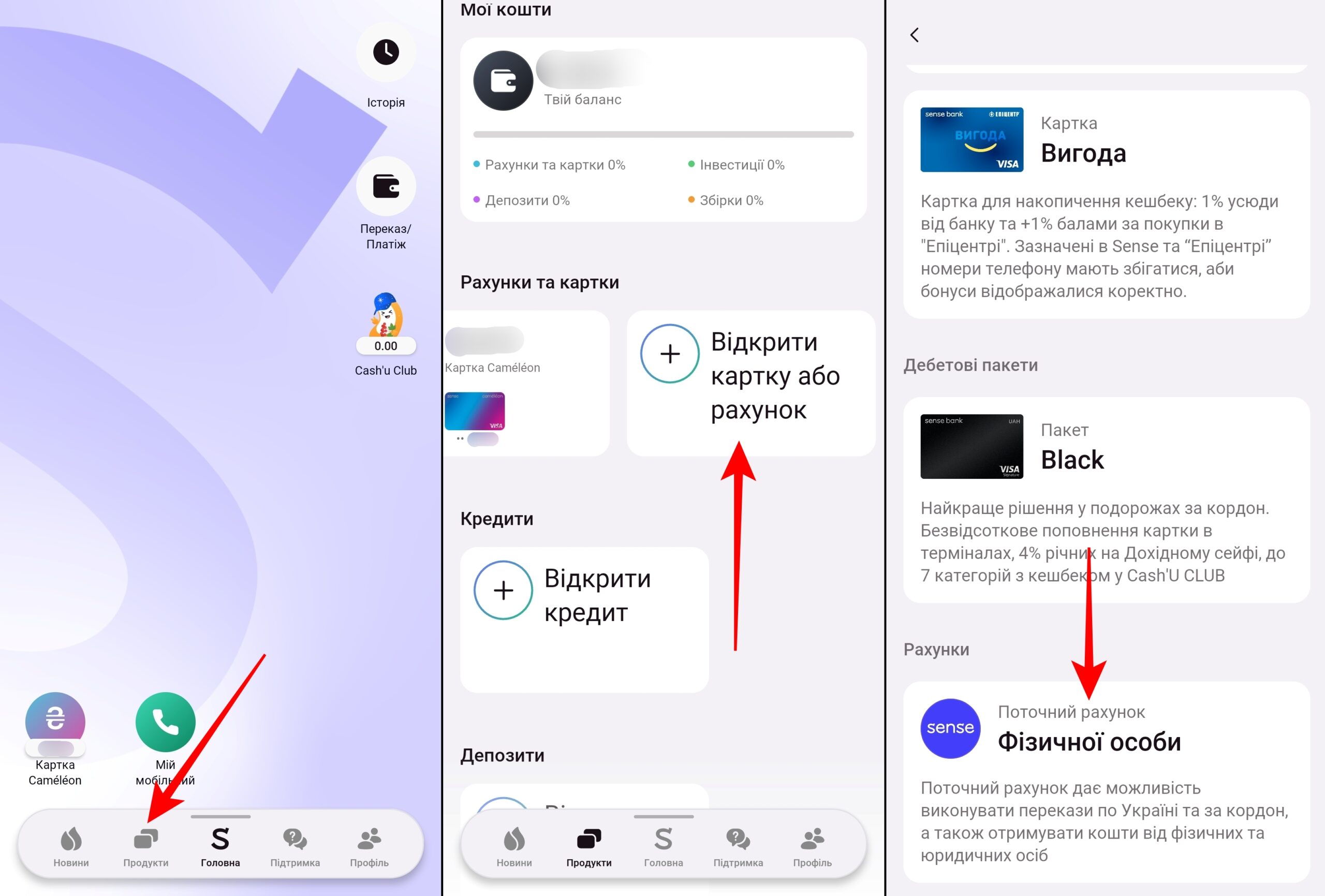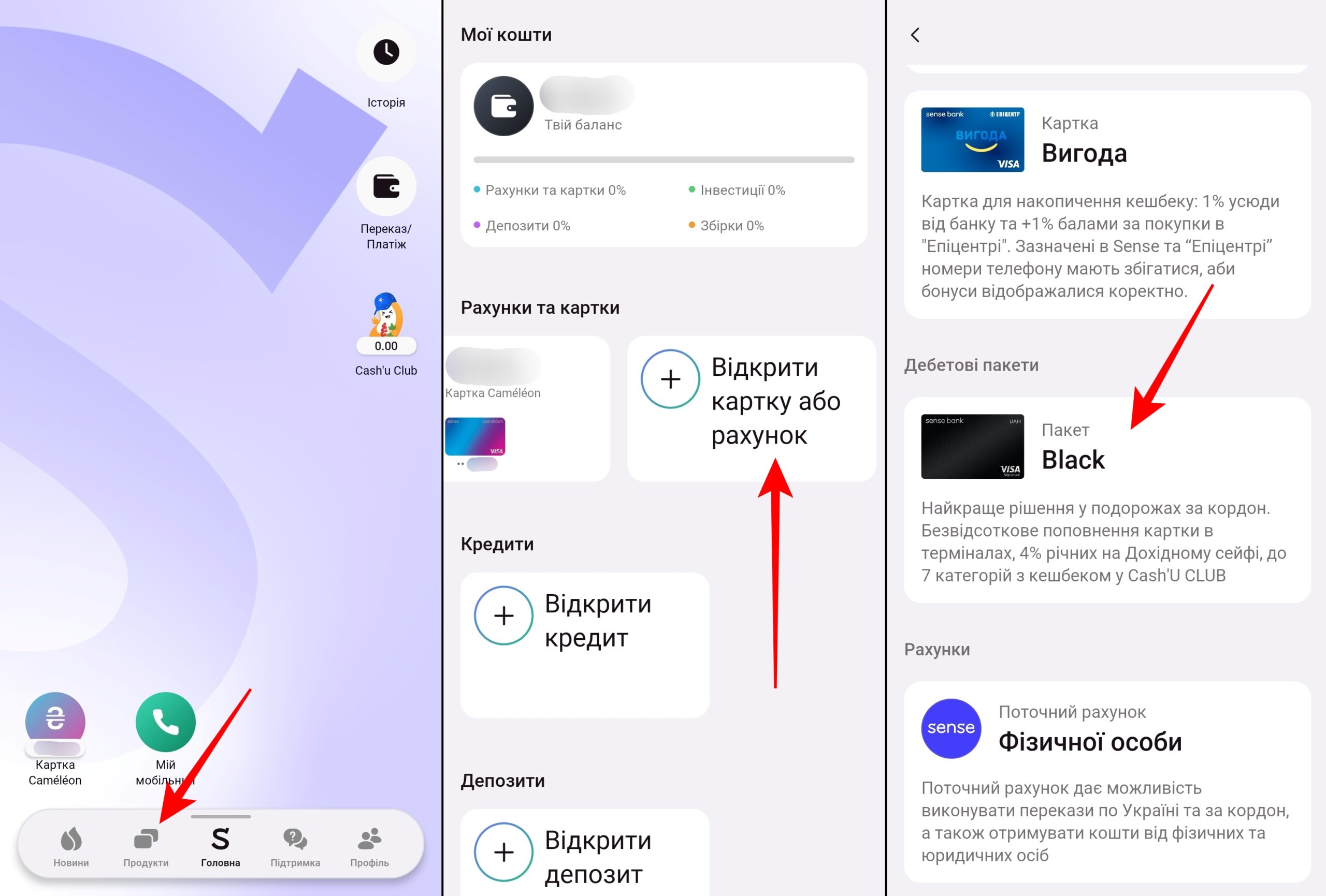 - У розділі “Продукти” натиснути “Відкрити картку або рахунок”;