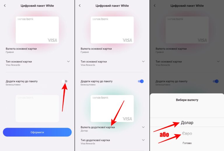 - Перейти у “Додати картку до пакета”, вибрати валюту картки та натиснути “Оформити”;