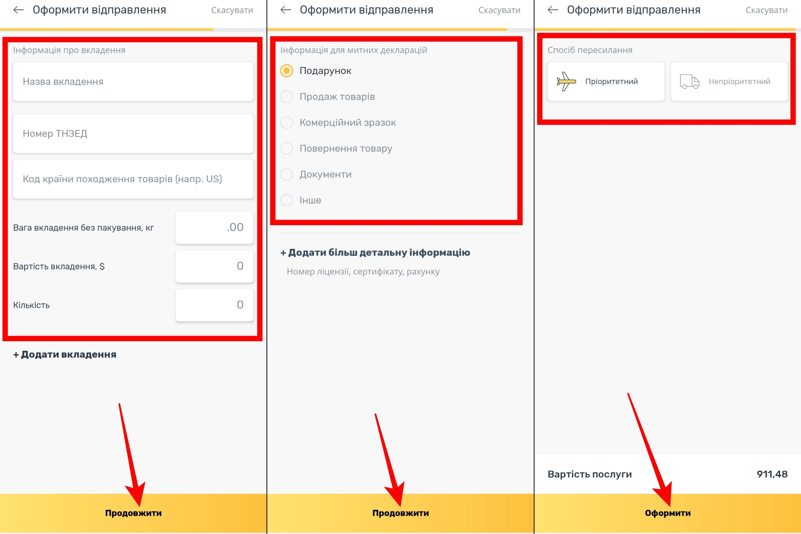 - Вибрати спосіб пересилання — пріоритетний чи непріоритетний. На цьому етапі відображатиметься вартість послуги.