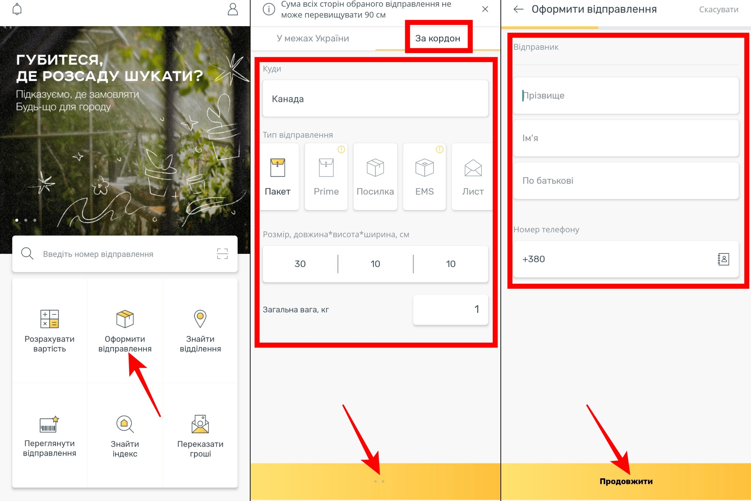 - Перейти у розділ “Оформити відправлення” — “За кордон”;