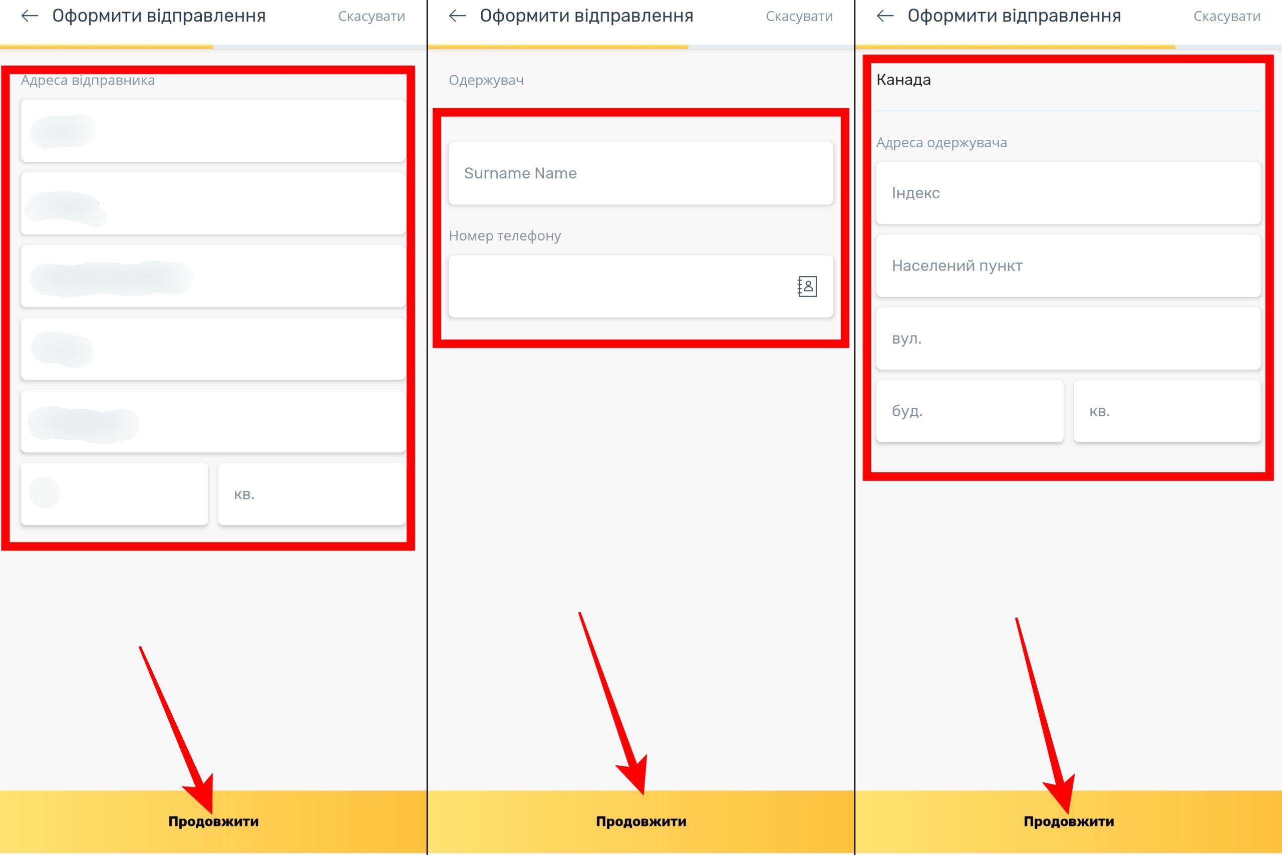 - Зазначити інформацію про отримувача: ПІБ, номер телефону, адресу (індекс, населений пункт, вулицю та будинок чи квартиру). Усі дані так само вказуються латиницею;