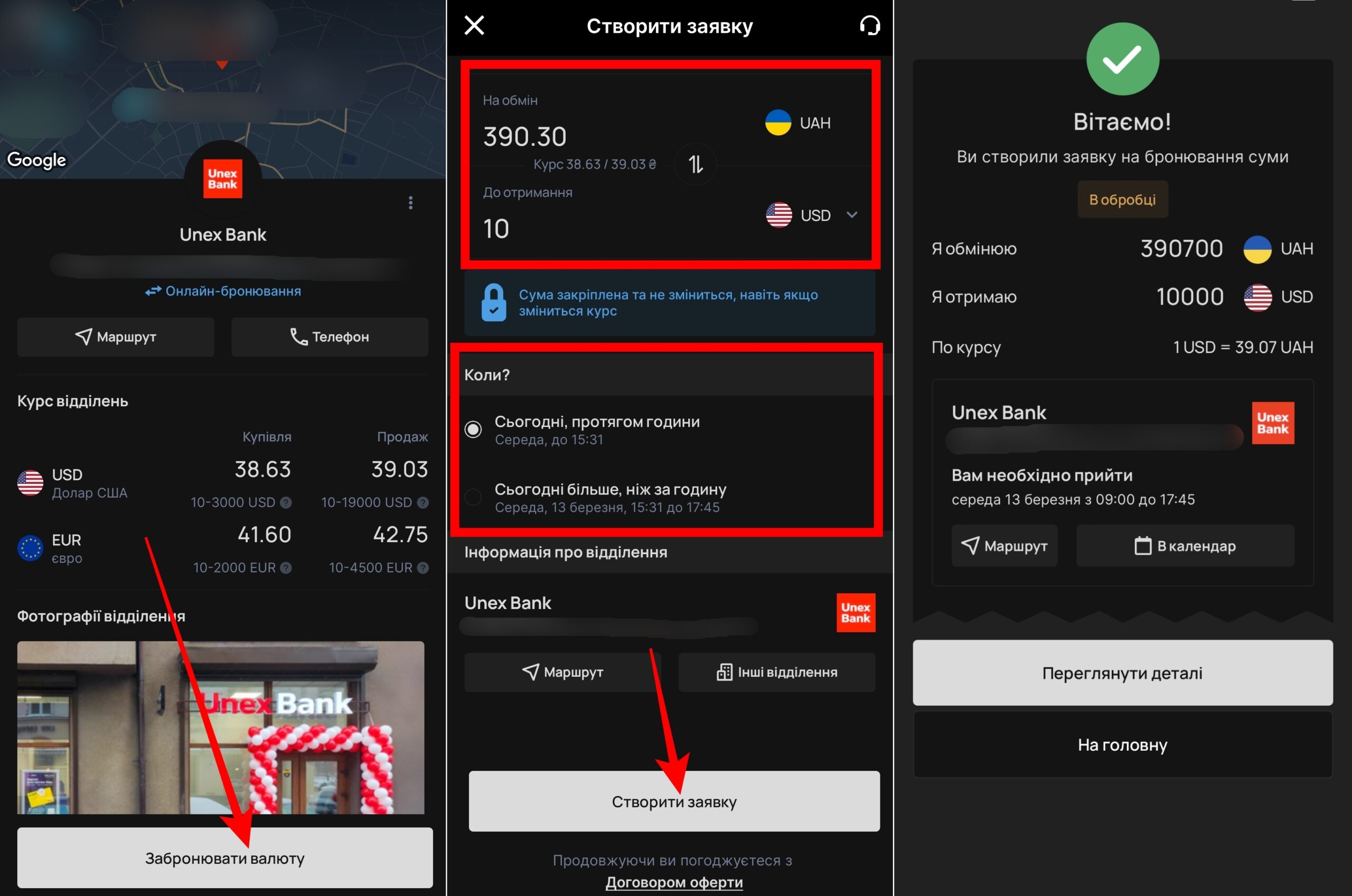 Здійснити обмін валюти можна до 17:45 з понеділка по четвер, до 16:45 – в п’ятницю. У відділенні Unex Bank необхідно повідомити код заявки та свій номер телефону. Також працівник банку може попросити показати документи для підтвердження джерела доходу коштів. Термін дії заявки обмежений одним робочим днем банку.