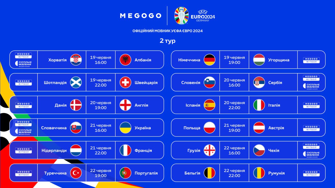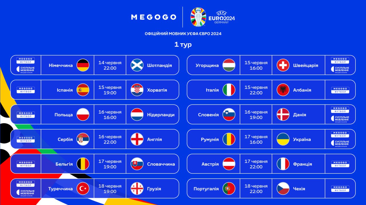 Розклад трансляцій матчів групового етапу Євро-2024: