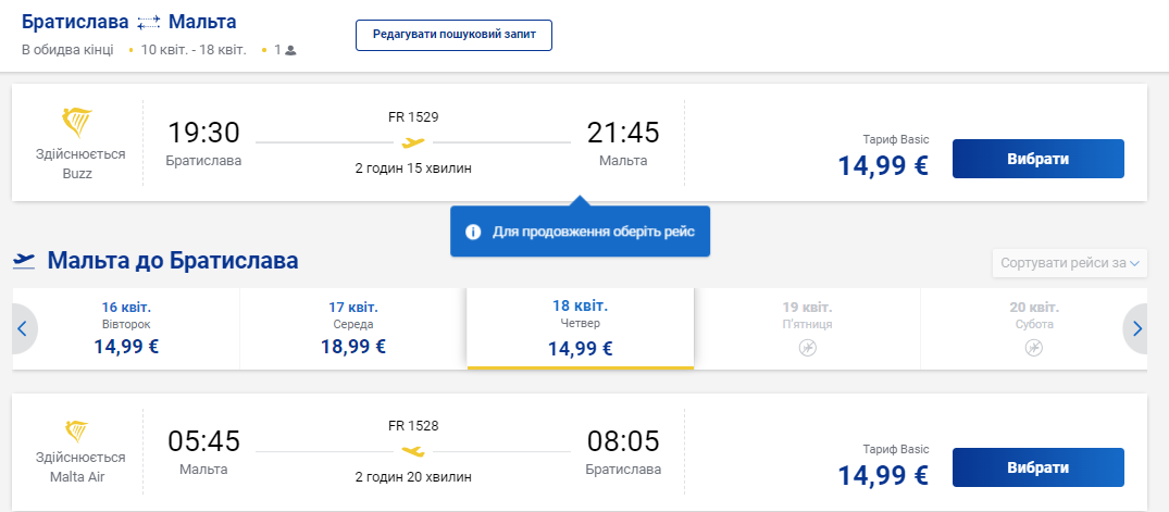 Зворотно за 15 євро можна полетіти 18 квітня. Виліт з Мальти о 5:45, приліт у Братиславу о 8:05. Час польоту – 2 години 20 хвилин.