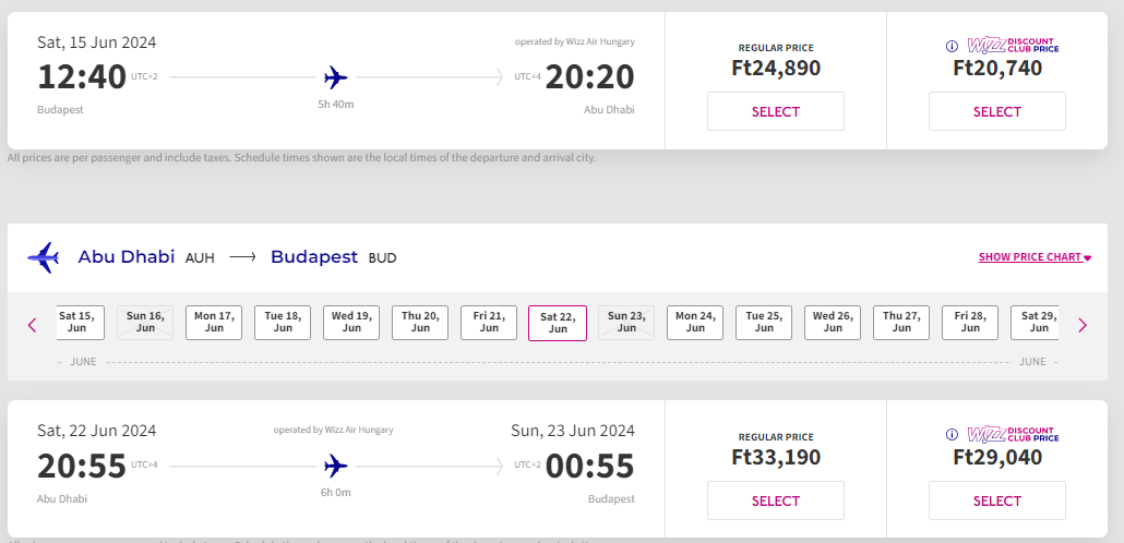 Лоукостер Wizz Air пропонує акційні квитки з Угорщини в Об’єднані Арабські Емірати на маршруті Будапешт — Абу-Дабі — Будапешт. Квитки зі знижкою доступні у певні дати червня 2024 року.