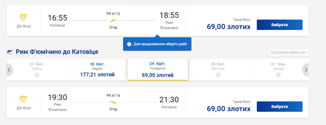 Наприклад, з Катовіце за 16 євро (приблизно 670 гривень) можна полетіти 22 квітня. Виліт з аеропорту Катовіце о 16:55, приліт до аеропорту Рим-Фьюмічіно о 18:55. Час польоту – 2 години.