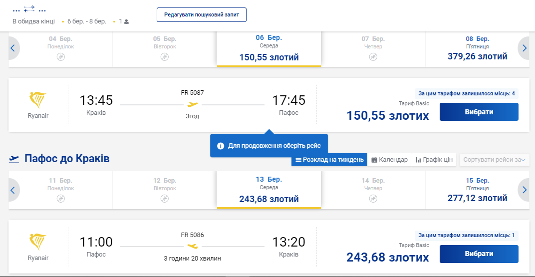 Лоукостер Ryanair пропонує акційні квитки з Польщі на Кіпр на маршруті Краків-Пафос-Краків. Квитки зі знижкою доступні на певні дати березня 2024 року.