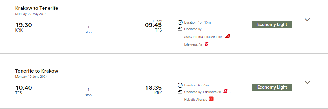 Зворотно з Тенерифе можна полетіти 10 червня за 64 євро (приблизно 2700 гривень). Виліт з Тенерифе о 10:40, приліт у Краків о 18:35. У дорозі так само передбачена одна пересадка у Цюриху. Загальний час подорожі – 6 годин 55 хвилин.