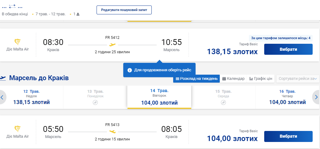 Наприклад, з Кракова можна полетіти 7 травня за 32 євро (приблизно 1300 гривень). Виліт з аеропорту Кракова о 8:30, приліт у Марсель о 10:55. Час польоту – 2 години 25 хвилин.