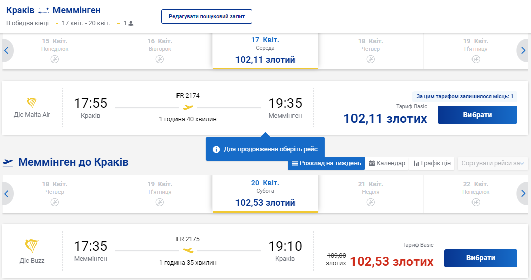 Наприклад, з Кракова за 24 євро (приблизно 1000 гривень) можна полетіти 17 квітня. Виліт з аеропорту Кракова о 17:55, приліт у Меммінген о 19:35. Час польоту – 1 година 40 хвилин.