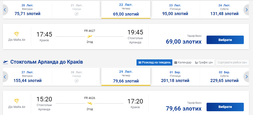 Наприклад, з Кракова за 16 євро (приблизно 650 гривень) можна полетіти 22 лютого. Виліт з Кракова о 17:45, приліт у Стокгольм о 19:45. Час польоту – 2 години.