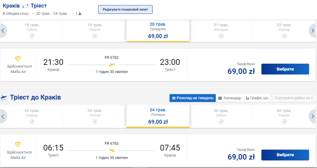 Наприклад, з Кракова можна полетіти 20 травня за 16 євро (приблизно 675 гривень). Виліт з Кракова о 21:30, приліт у Трієст о 23:00. Час польоту – 1 година 30 хвилин.