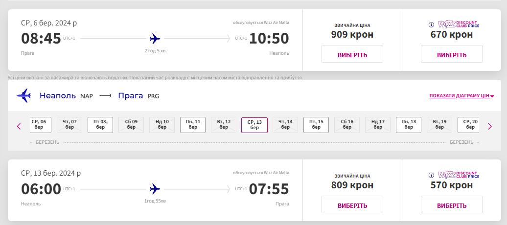 Лоукостер Wizz Air пропонує акційні квитки з Праги в італійське місто Неаполь. Квитки зі знижкою доступні на певні дати березня 2024 року.