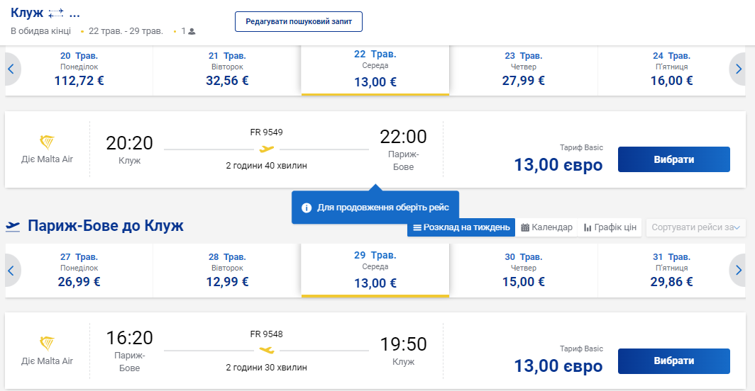Наприклад, полетіти з Клужа в Париж за 13 євро (приблизно 550 гривень) можна 22 травня. Виліт з аеропорту Клуж-Напока о 20:20, приліт до аеропорту Париж-Бове о 22:00. Час польоту – 2 години 40 хвилин.