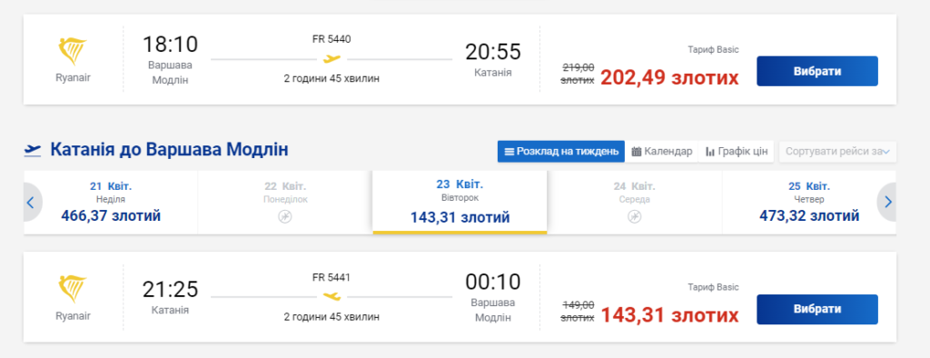 Наприклад, з Варшави за 47 євро (приблизно 1900 гривень) можна полетіти 16 квітня. Виліт з аеропорту Варшава-Модлін о 18:10, приліт у Катанію о 20:55. Час польоту – 2 години 45 хвилин.