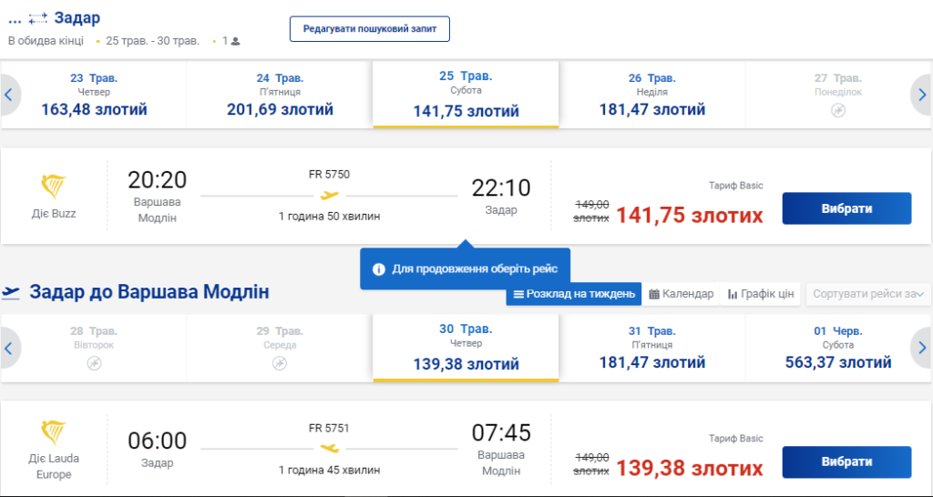 Наприклад, з Варшави можна полетіти 25 травня за 33 євро (приблизно 1300 гривень). Виліт з аеропорту Варшава-Модлін о 20:20, приліт у Задар о 22:10. Час польоту – 1 година 50 хвилин.